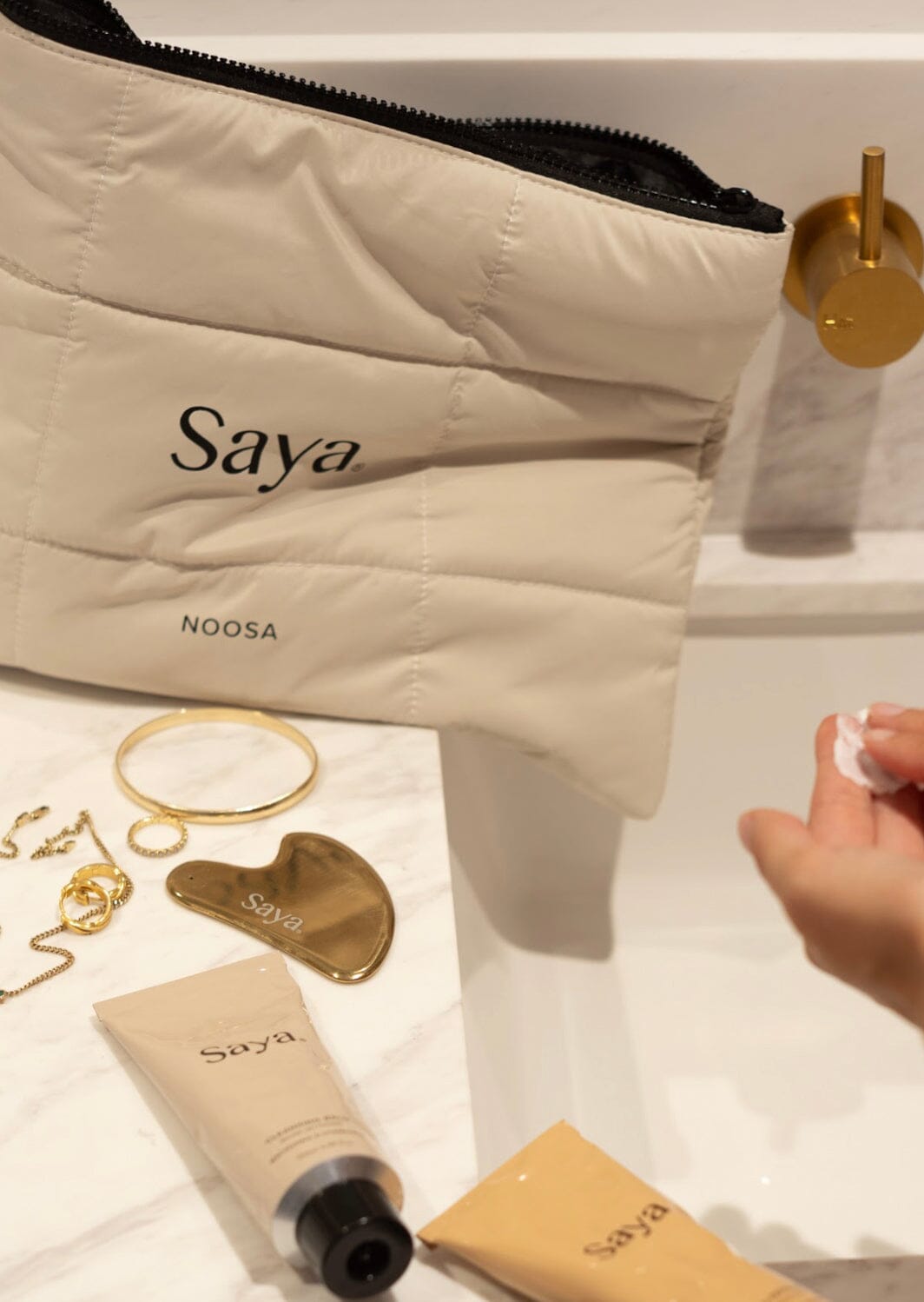 Designed for versatility, it features a durable metal zipper with a branded Saya pull tag, padded polyester fibre filling for a soft yet structured feel, and generous space that fits your skincare, toiletries, beach essentials, or everyday items. Lightweight and easy to pack, it’s the ideal companion for beach days, travel, gym days, weekend escapes and daily organisation.